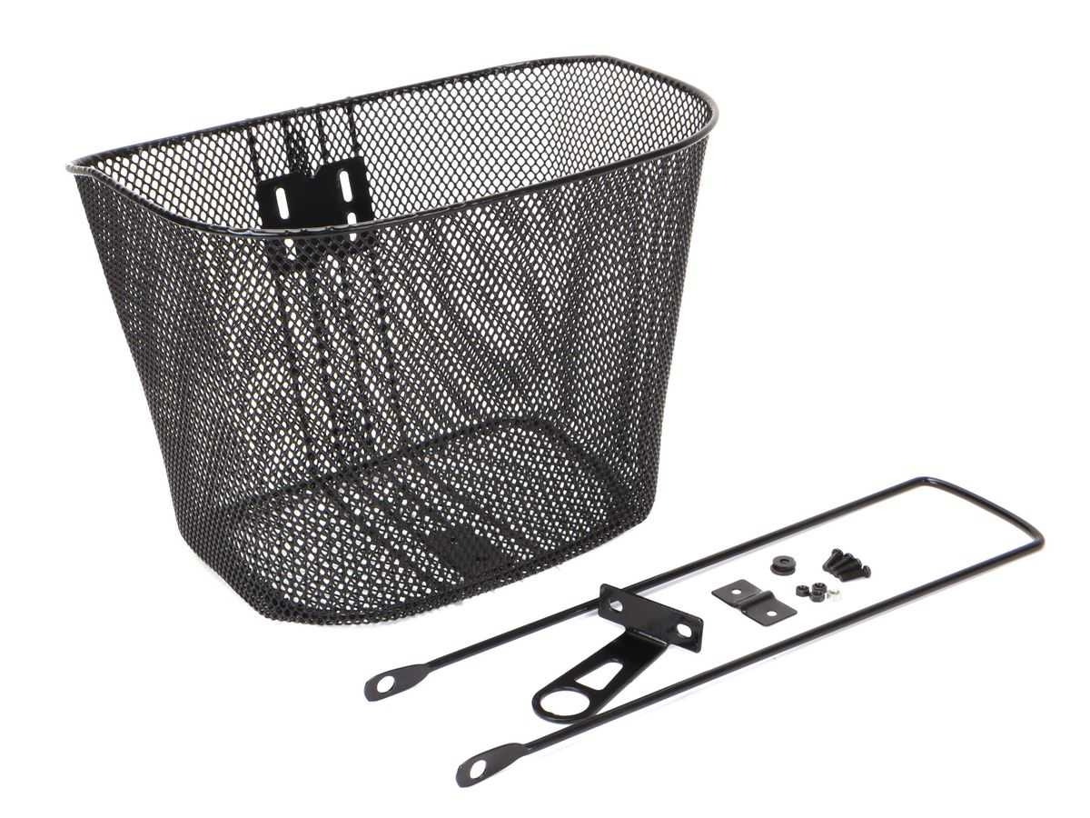 Koszyk rowerowy na kierownicę, wykonany ze stalowej siatki, dno wzmocnione stalowymi prętami, mocowany na uchwycie pod lożyskiem kierownicy, w kpl. wspornik oraz uchwyt wraz ze śrubami, kolor czarny