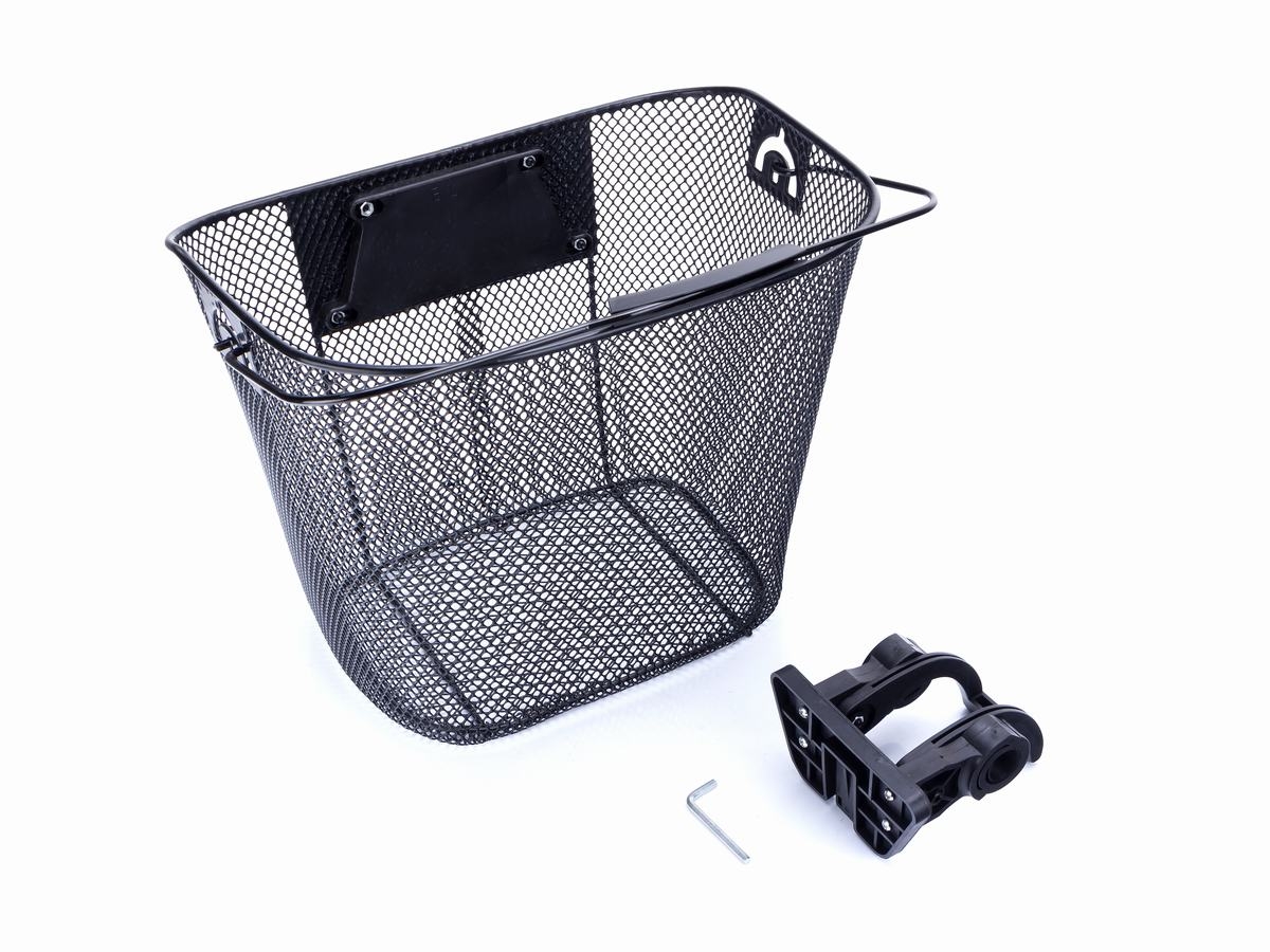 Koszyk rowerowy na kierownicę, wykonany ze stalowej siatki z raczką, dno wzmocnione stalowymi prętami, mocowany na uchwycie zamocowanym do rury kierownicy, uchwyt w kpl. , kolor czarny