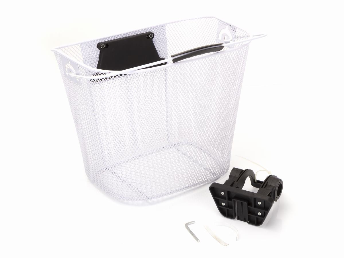 Koszyk rowerowy na kierownicę, wykonany ze stalowej siatki z raczką, dno wzmocnione stalowymi prętami, mocowany na uchwycie zamocowanym do rury kierownicy, uchwyt w kpl. , kolor biały