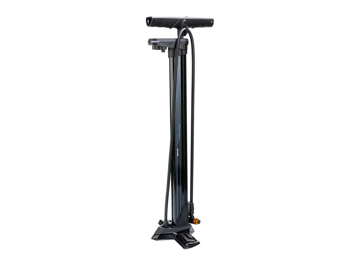 Pompka rowerowa stojąca, aluminiowa, możliwość pompowania zaworów DV/AV/FV .Ciśnienie robocze do 240 psi / 16,5 bar /. Wysokość 75 cm.Waga 2140 g. Kolor czarny.
