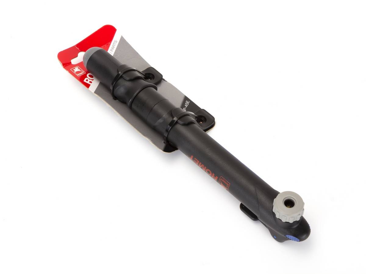 Pompka rowerowa mini , plastikowa na zawór DV/AV/FV z uchwytem pod bidon. Logo ROMET