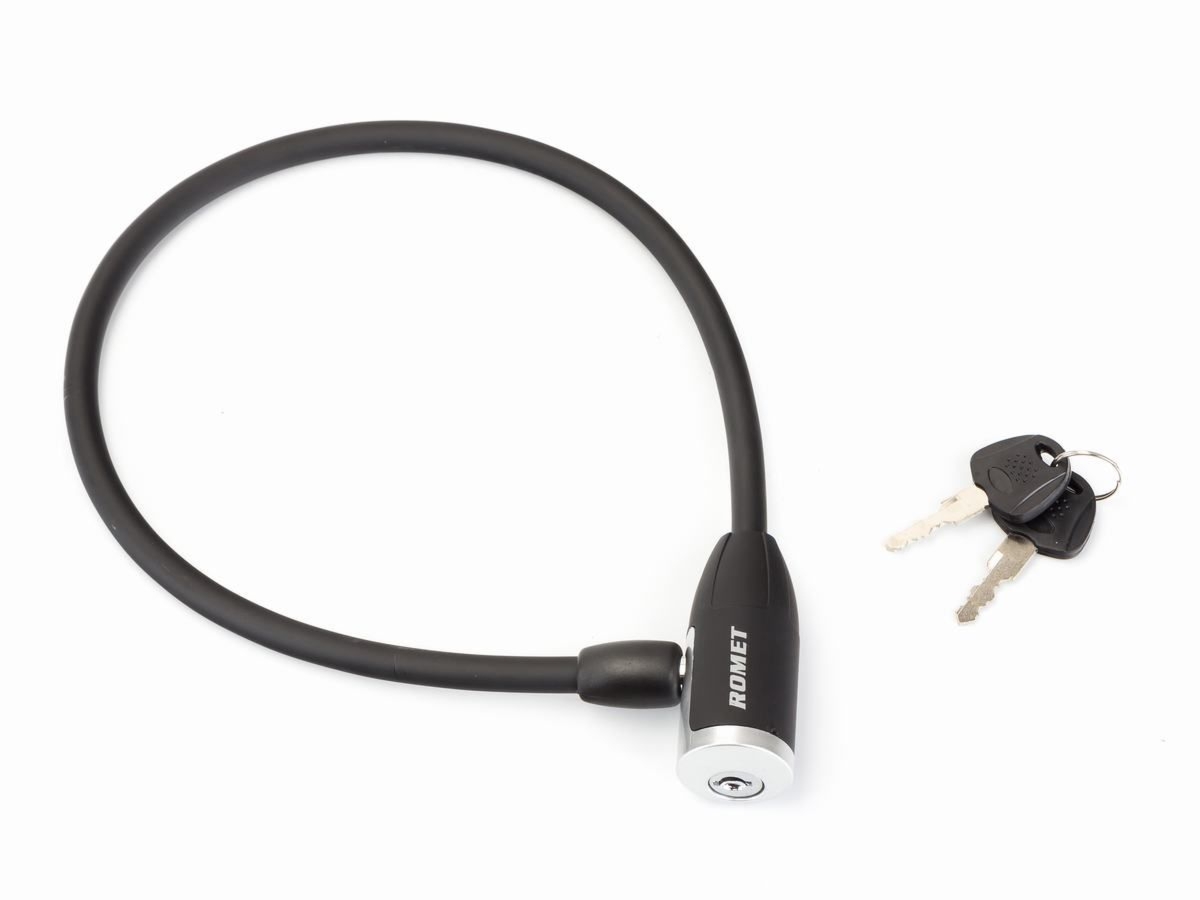 Zapięcie rowerowe wykonana z wysokiej jakości przewodu stalowego o średnicy 10 mm i długości 65 cm, pokryty osłoną PCV w kolorze czarnym. Zapięcie zamykane na klucz,