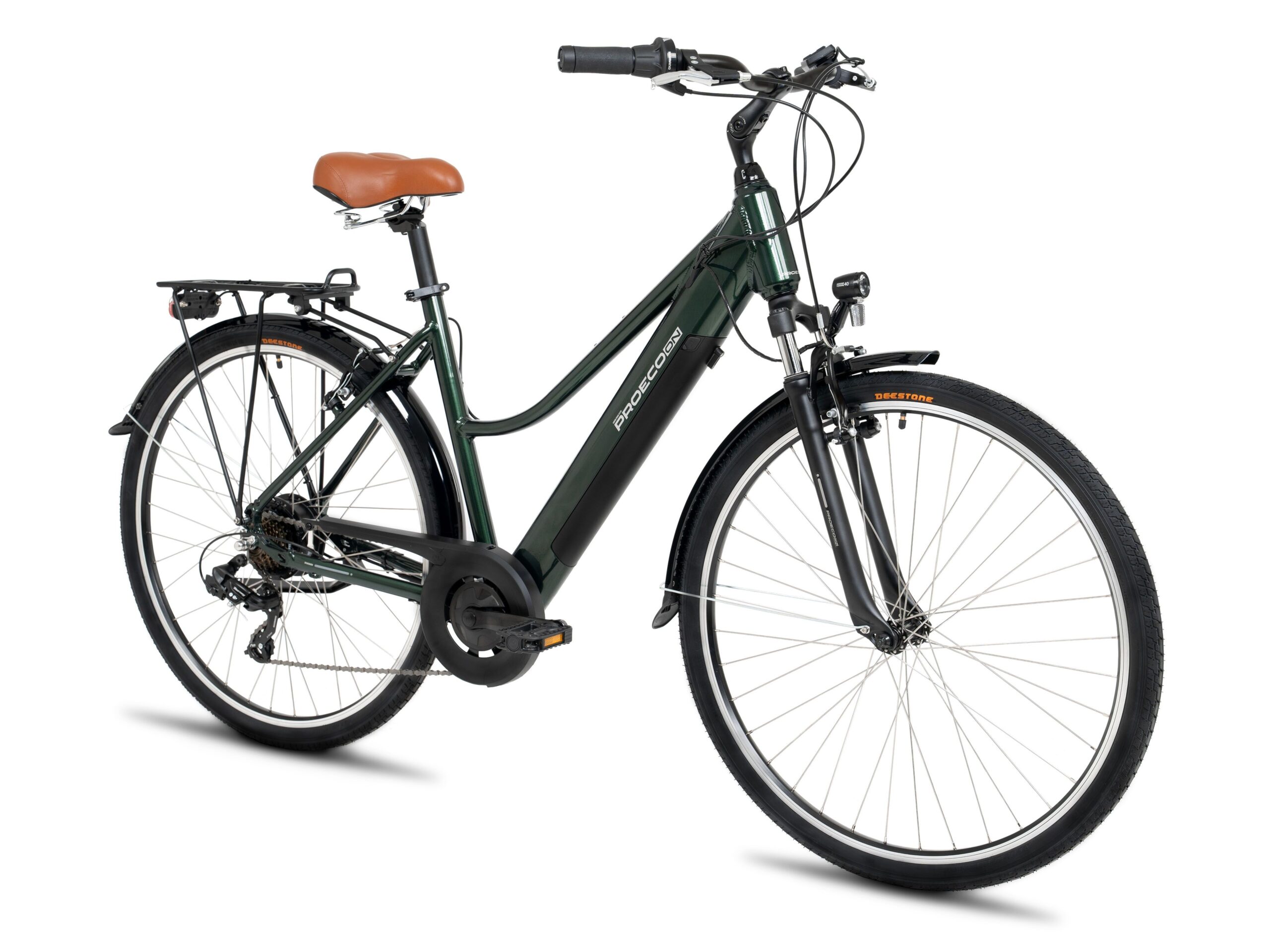 <h3><strong>Proeco TRK Low Frame 1.0 – elegancki rower elektryczny dla aktywnych kobiet</strong></h3><p><strong>Proeco TRK Low Frame 1.0</strong> to stylowy i funkcjonalny <strong>rower elektryczny trekkingowy</strong>, zaprojektowany z myślą o kobietach, które cenią komfort, wygodę i nowoczesny design. Lekka, a jednocześnie wytrzymała <strong>aluminiowa rama o obniżonym przekroku</strong> ułatwia wsiadanie i zsiadanie, sprawiając, że jazda jest przyjemna i bezpieczna w każdych warunkach.</p><p>Za wspomaganie odpowiada <strong>mocny silnik Ananda umieszczony w tylnym kole</strong>, zapewniający płynną, dynamiczną jazdę zarówno po miejskich ulicach, jak i na dłuższych trasach trekkingowych. Energię dostarcza <strong>akumulator o pojemności 504 Wh</strong>, elegancko zintegrowany z ramą – gwarantuje on duży zasięg i nowoczesny wygląd roweru.</p><p>Rower wyposażony został w <strong>przerzutkę Shimano Tourney</strong>, która zapewnia niezawodną i precyzyjną zmianę biegów. <strong>Amortyzator przedni</strong> skutecznie tłumi nierówności nawierzchni, zwiększając komfort jazdy, a <strong>ergonomiczna kierownica i miękkie siodełko</strong> zapewniają wygodną, naturalną pozycję podczas każdej podróży.</p><p>Dla pełnej funkcjonalności i bezpieczeństwa, rower posiada <strong>pełne błotniki</strong>, <strong>stabilną podpórkę</strong> oraz <strong>zintegrowane oświetlenie</strong>, dzięki czemu jest w pełni gotowy do jazdy od razu po wyjęciu z pudełka.</p><h3><strong>Najważniejsze cechy:</strong></h3><ul><li>Lekka i mocna <strong>aluminiowa rama typu Low Frame</strong> – damska geometria