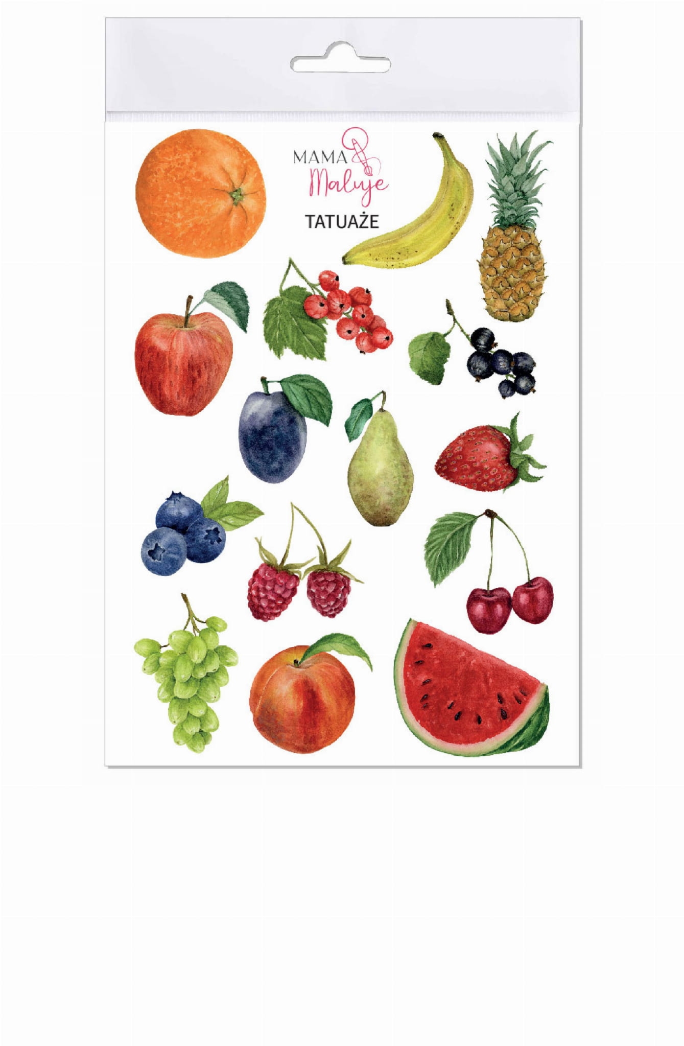 Tatuaże zmywalne OWOCE Najpiękniejsze tatuaże zmywalne Zachwycające, apetyczne, soczyste i przede wszystkim kolorowe. Takie właśnie są tatuaże owoce. Dlaczego warto wybrać te tatuaże? Przepiękne ilustracje owoców mogą teraz znaleźć się na Twojej skórze jako zmywalne tatuaże. Spodobają się zarówno dzieciom, jak i dorosłym! Wyróżniają się realizmem i dbałością o szczegóły. Tatuaże te mogą być świetną pomocą w edukacji oraz ciekawym urozmaiceniem warsztatów kulinarnych, plastycznych czy przyrodniczych. To także oryginalny pomysł na prezent. Sprawdzą się doskonale w codziennych zabawach, na urodzinach czy imprezach tematycznych. Testowane dermatologicznie Ręcznie malowane ilustracje Łatwe do zmycia Wyprodukowano w Polsce Kreatywna zabawa dla całej rodziny Tatuaże zmywalne Owoce to świetna propozycja wspólnej zabawy dla całej rodziny. Dzieci z radością poznają różne owoce, a przy tym rozwijają wyobraźnię i spędzają twórczo czas z bliskimi. Format 14 x 9,5 cm Ilość 15 sztuk na arkuszu Aplikacja woda, 30 sekund Trwałość 2–5 dni Usuwanie woda + oliwka/mydło Wiek 3+ Tatuaże to świetny dodatek na: • urodziny • warsztaty edukacyjne • festyny i pikniki • bale przebierańców • rodzinne sesje kreatywne Dlaczego warto wybrać nasze tatuaże? Wyjątkowe, ręcznie malowane wzory, które zachwycają dzieci i dorosłych, W 100% polska produkcja, wspierająca lokalne drukarnie, Stonowana, elegancka paleta barw – naturalny efekt na skórze, Bezpieczna aplikacja i łatwe usuwanie (woda + oliwka/mydło). Jak nakleić tatuaż? To proste! 1 Wytnij Wytnij wybrany wzór z arkusza 2 Zdejmij folię Usuń przezroczystą folię ochronną 3 Przyłóż Przyłóż obrazkiem do suchej skóry 4 Zmocz Przyciśnij mokrą gąbką przez 30 sekund OK Gotowe! Delikatnie zdejmij papier Poznaj autorkę ilustracji Iwona Świerczek – ilustratorka, malarka akwarelowa, założycielka Wydawnictwa Mama Maluje. Autorka wielu produktów dla dzieci wspierających rozwój w duchu metody Montessori. Inspiracje czerpie głównie z natury. Jej ilustracje wyróżnia realizm i dbałość o szczegóły. 30.000+ sprzedanych produktów setki ilustracji mama 4 dzieci Cieszę się, że moje produkty pomagają tysiącom dzieci rozwijać się i bawić każdego dnia. Pomysły na kreatywną zabawę Szukasz inspiracji, jak wykorzystać tatuaże Owoce w twórczej zabawie z dziećmi? Zajrzyj tutaj: ZOBACZ NASZE POMYSŁY NA ZABAWY Z UŻYCIEM TATUAŻY OWOCE Czy tatuaże są bezpieczne dla dzieci? Tak. Tatuaże są testowane dermatologicznie, mają certyfikaty CE i są bezpieczne dla dzieci powyżej 3 lat. Nie zawierają szkodliwych substancji. Jak długo tatuaż utrzymuje się na skórze? Zwykle 2–5 dni, zależnie od miejsca aplikacji i częstotliwości mycia. Na mniej eksponowanych obszarach może utrzymać się dłużej. Czy tatuaże są wodoodporne? Tak, po wyschnięciu są wodoodporne. Kąpiel czy basen im nie straszne, choć intensywne pocieranie skraca trwałość. Jak usunąć tatuaż wcześniej? Użyj oliwki, olejku dla dzieci lub tłustego kremu. Nałóż, odczekaj chwilę i zetrzyj wacikiem. Ile wzorów jest w zestawie? Na arkuszu 140 × 95 mm znajduje się 15 ilustracji owoców (pomarańcza, banan, ananas, jabłko, czerwona porzeczka, czarna porzeczka, śliwka, gruszka, truskawka. borówka amerykańska, malina, wiśnia, winogrona, brzoskwinia, arbuz).
