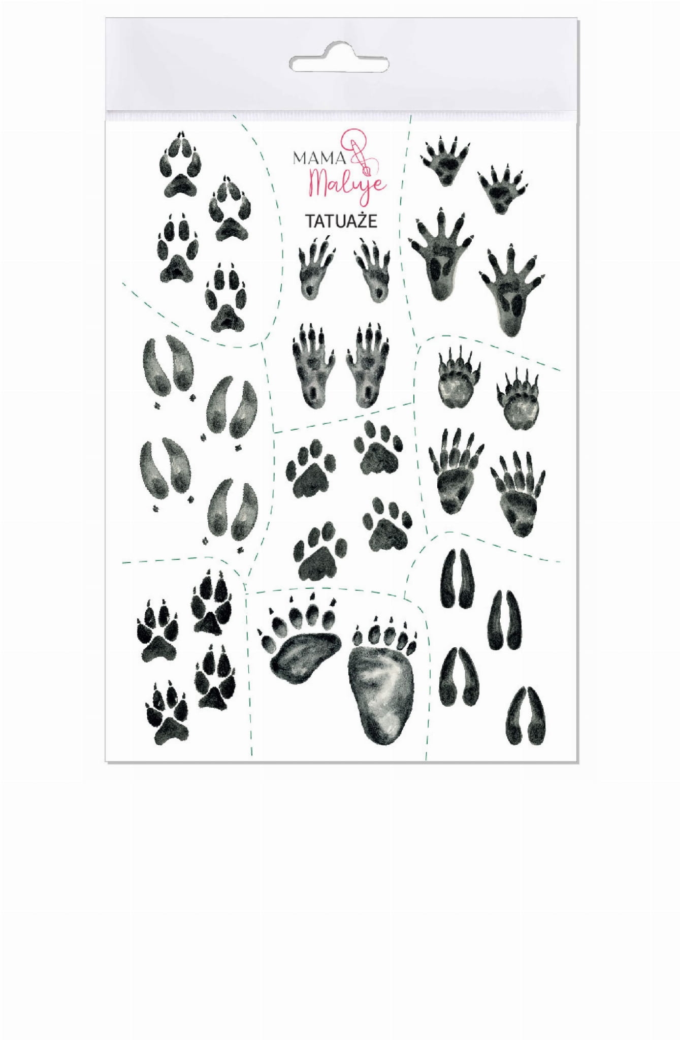 Na arkuszu znajdują się tropy: dzika, sarny, niedźwiedzia, wilka, lisa, rysia, wiewiórki, bobra i borsuka. Tatuaże zmywalne Tropy zostały wykonane na podstawie ręcznie malowanych ilustracji akwarelowych. Uwzględniają realny wygląd każdego tropu, dlatego powodzeniem można wykorzystywać je w celach edukacyjnych. A nie od dziś wiadomo, że najlepsza jest nauka poprzez zabawę.   ZOBACZ NASZE POMYSŁY NA ZABAWY Z UŻYCIEM TATUAŻY TROPY >>   Produkt jest bezpieczny dla skóry i posiada niezbędne atesty dermatologiczne. Tatuaże zostały wyprodukowane w Polsce. Wymiary arkusza: 9,5×14 cm.
